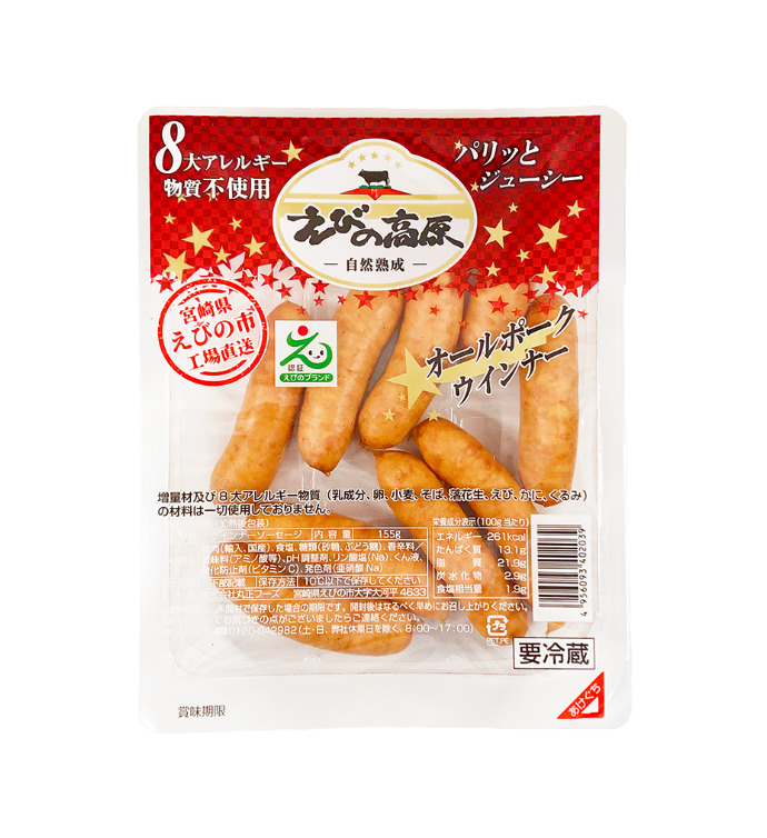 豚肉(輸入、国産)、食塩、糖類(砂糖、ぶどう糖)、香辛料/調味料(アミノ酸等)、pH調整剤、リン酸塩(Na)、くん液、酸化防止剤(ビタミンC)、発色剤(亜硝酸Na)