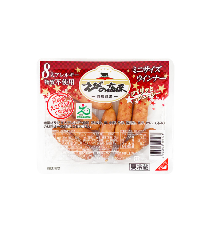畜肉〔豚肉(輸入、国産)、牛肉(国産)〕、食塩、糖類(砂糖、ぶどう糖)、香辛料/糊料(加工でん粉)、調味料(アミノ酸等)、pH調整剤、リン酸塩(Na)、くん液、酸化防止剤(ビタミンC)、発色剤(亜硝酸Na)